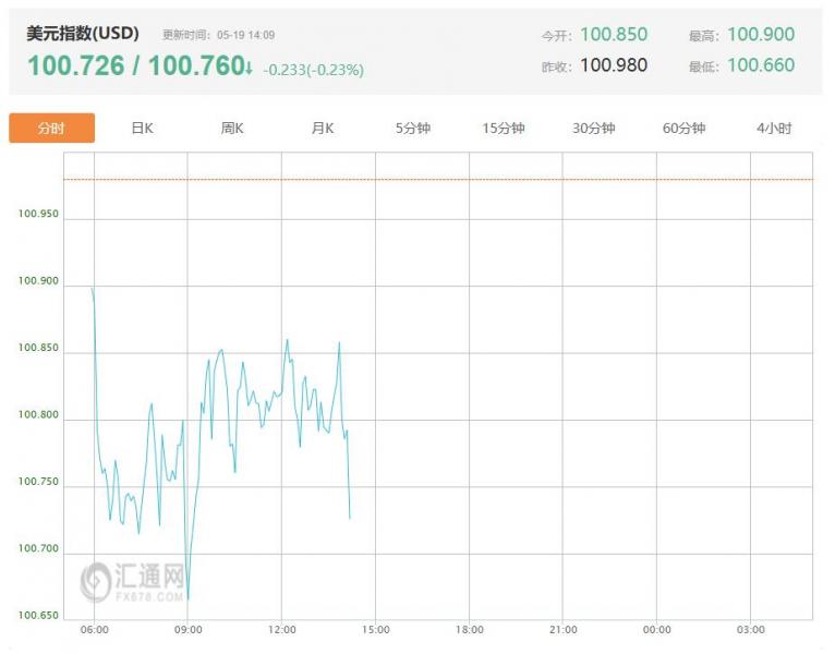 周一(5月19日)亚洲时段,美元指数小幅走低,目前交投于100.760附近,美元上周五走强,连续第四周上涨。最新一轮经济数据显示4月进口物价反弹,而5月消费者信心仍然低迷,因对总统特朗普贸易政策影响的担忧加剧。