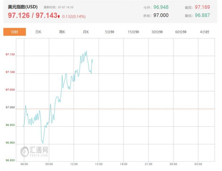 周一(7月7日)亚盘早盘,美元指数最新价报97.143,涨幅0.14%,开盘价为96.95。美国财政部长斯科特·贝森特质疑美联储决策者对利率的判断,重申其观点,即两年期国债收益率表明基准利率过高。