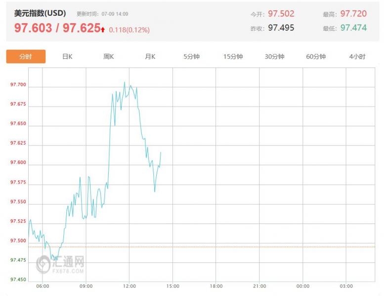 周三(7月9日)亚市盘中,美元指数维持上行,最新美元指数报97.625,涨幅0.12%,短期美元指数继续反弹,主要是避险情绪回落,同时美联储降息预期放缓,支撑美元走高。