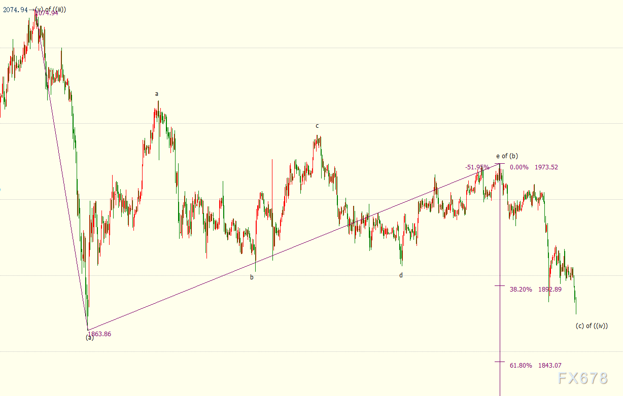 小时图上看,现货黄金处于自1974美元开启的下行(c)浪中,目前已经跌破38.2%目标位1893美元,下方支撑看向50%目标位1868美元和61.8%目标位1843美元。(c)浪则隶属于自2075美元开启的下行((iv))浪。