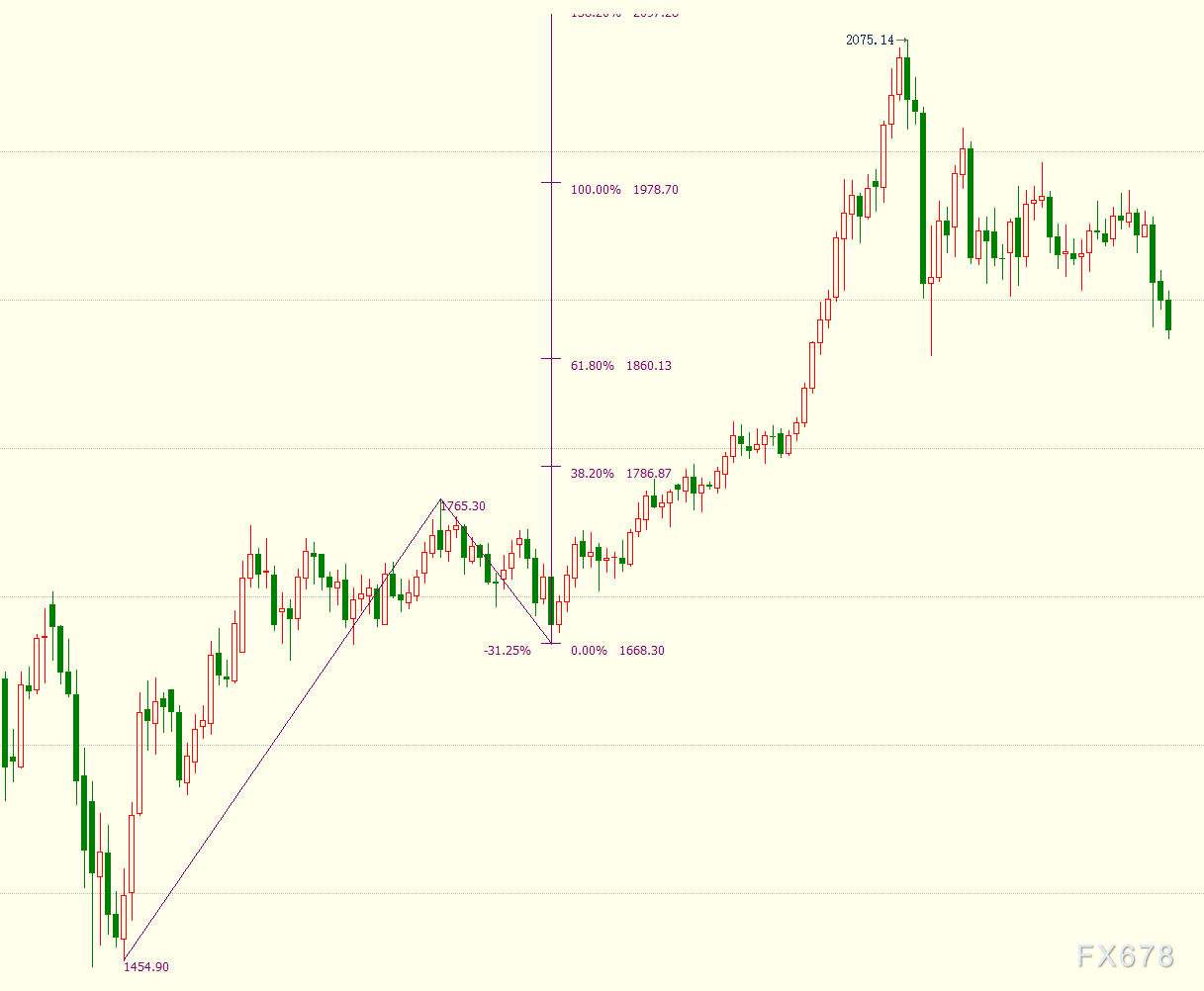 日线图上看,金价或跌向1787美元,该价位是自1668美元开启的上行((iii))浪的38.2%目标位。((iii))浪和((iv))浪都是自1455美元开启的上行3浪的子浪。