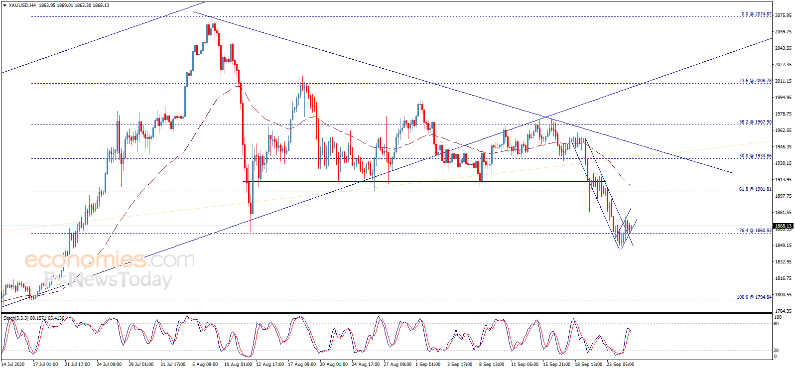 金价昨日收盘位于1860.90美元/盎司上方,这暗示金价试图止住主导近期交易的看空压力。但我们注意到,随机指标目前传递负面信号,此外,从4小时图来看,EMA 50指标对金价施压。