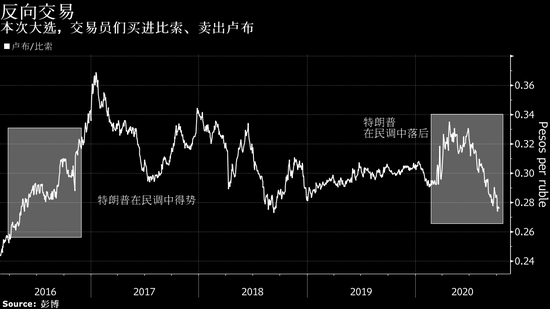 据报道,时隔四年汇市交易员又做起了“特朗普交易”,这一次赌他会输。这一交易涉及墨西哥比索和俄罗斯卢布,这两大新兴市场国家被认为受到特朗普外交政策的影响最大。过去三个月,比索兑美元上涨了超过6%,在主要新兴市场货币中表现最佳,原因是投资者预计拜登政府将会加大刺激力度,从而提振墨西哥对美国的出口。同期内,俄罗斯卢布下滑了8%,市场预计民主党入主白宫,会更有可能对俄罗斯实施更加严格的制裁。