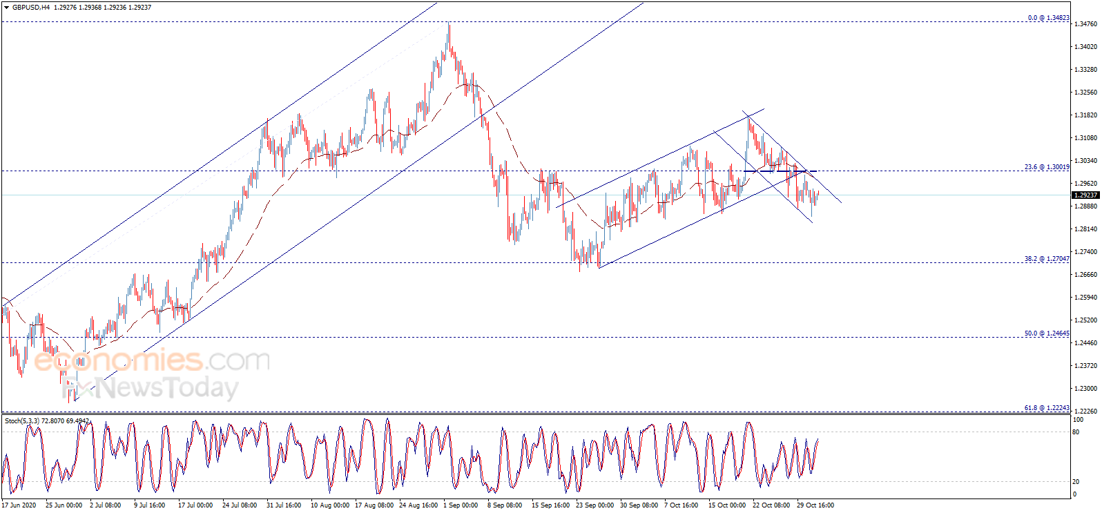 如图所示,英镑/美元温和上涨,并接近看空通道阻力。EMA 50指标与这一阻力相遇,从而增加了该水平的阻碍力度,此外,随机指标目前接近超买区域。