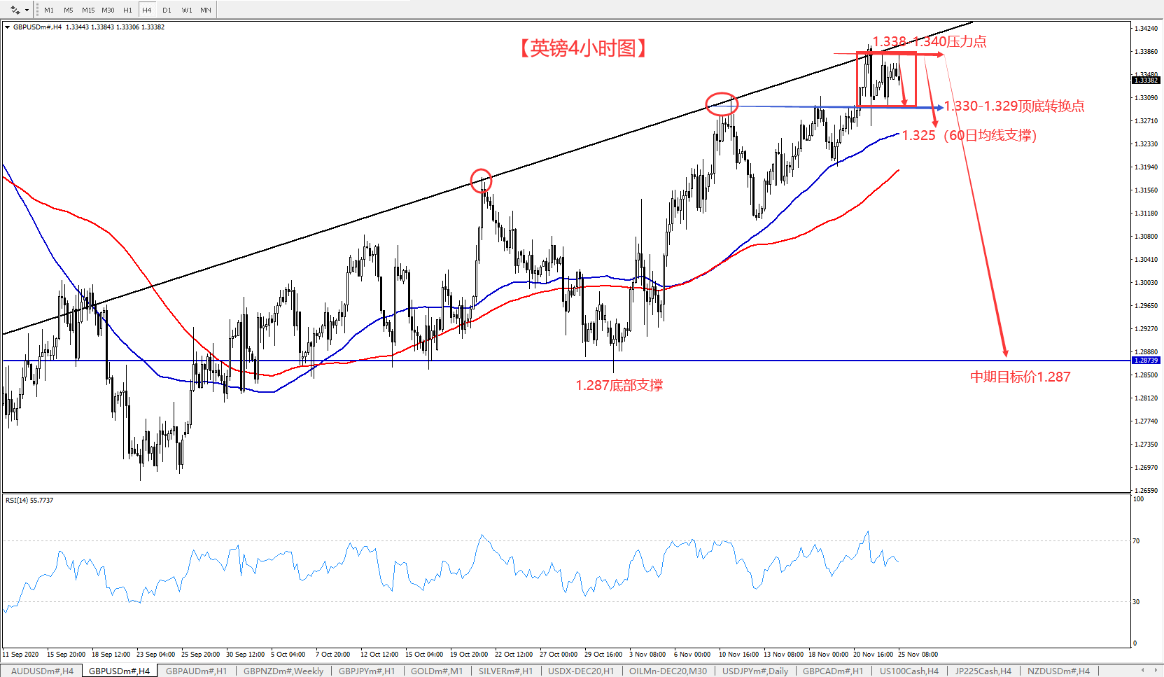 参与的交易,1.326-1.338目前两层仓已经顺利进场,接下来的时间只需要关注1.330-1.329的支撑,然后是上方1.338-1.340的压力,中期目标1.287不变(周期-3周)做短线的,你们可以选择见利就收。