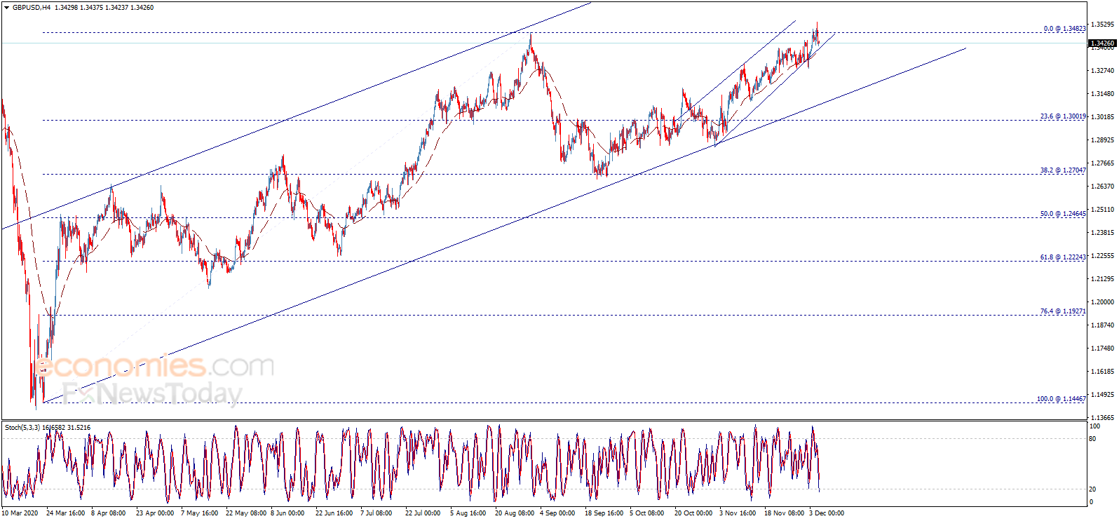 英镑/美元未能确认突破1.3482水平,如图所示,该汇价出现下跌,并测试看涨通道支撑线。不过,随机指标触及超卖区域。