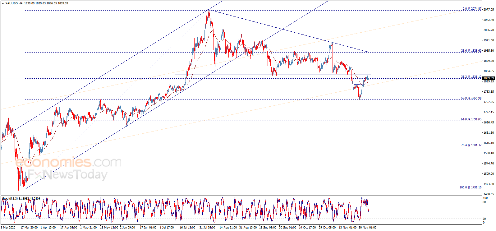 金价继续围绕1838.10美元/盎司水平波动,随机指标开始摆脱其负面动能,目前等待随机指标获得正面推动力,从而帮助推动金价突破1850.00美元/盎司。若如此,这将确认为金价升向下一看涨目标1870.00美元/盎司打开道路。