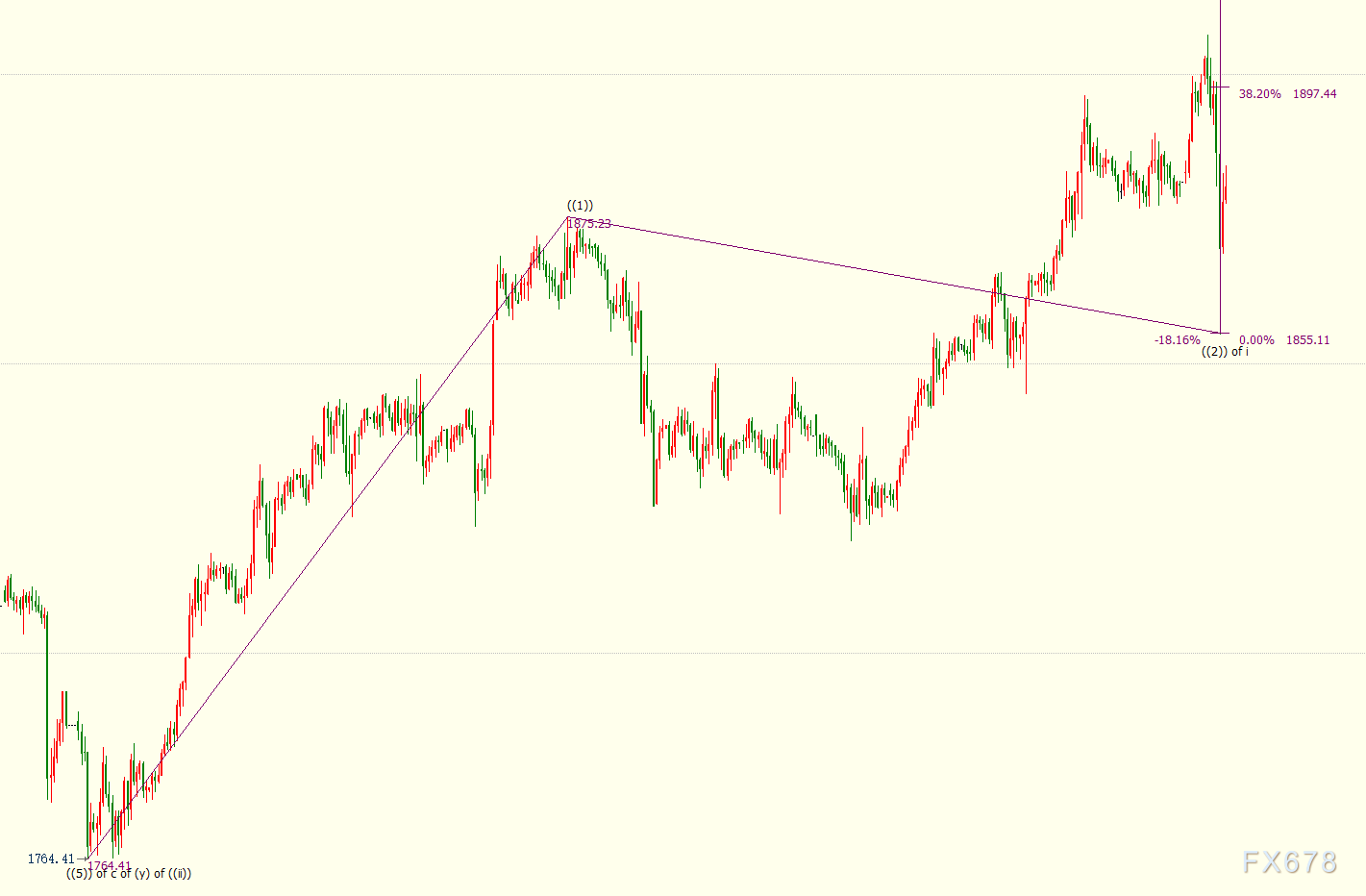日线图上看,金价自1764美元开启上行((iii))浪走势,(i)浪是((iii))浪的子浪。((iii))浪的23.6%和38.2%目标位分别在1911美元和2002美元,((iii))浪是自1451美元开启的上行5浪的子浪。