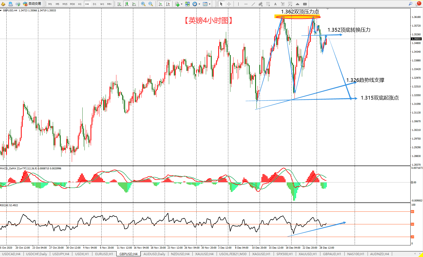交易方面,1.352做空之后,下方如果破位1.348,那么将继续跟进补仓交易,反之如果上方进行突破1.352,那么也就意味着这段趋势属于回踩,并不是4小时结构的双顶。