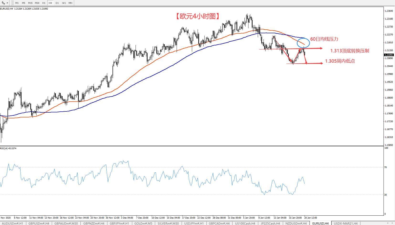 上一个交易日参与空的朋友,注意了,下方初步目标是看待昨天的前低1.305,上方防守直接挂今天的高点1.2155就行了。