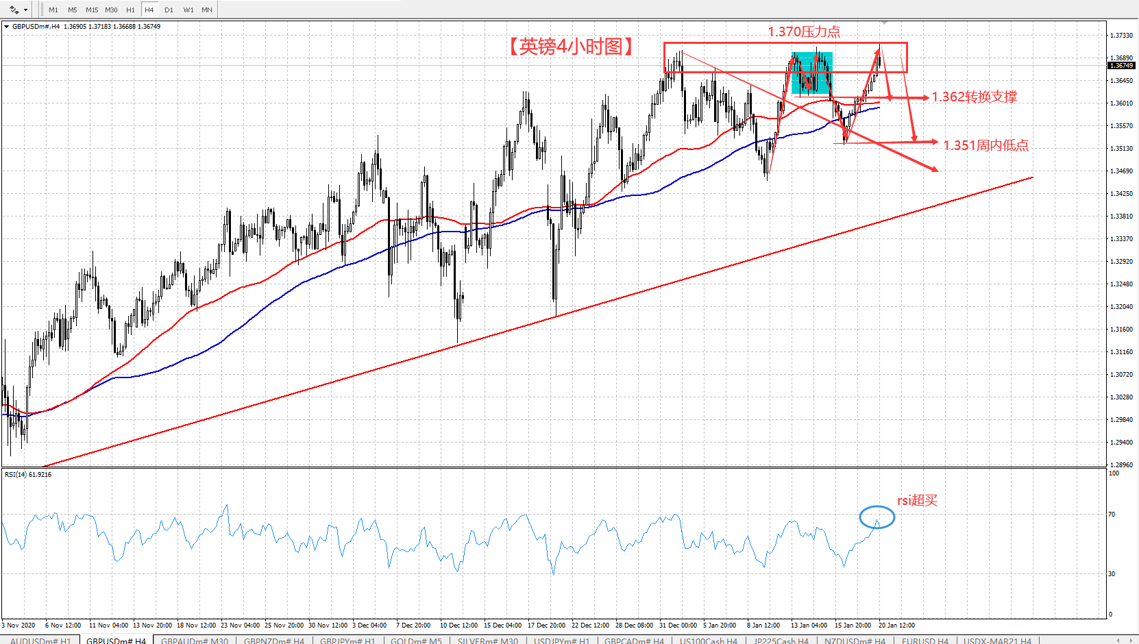 针对于接下来的行情,先空到1.364再说,然后是看1.360的支撑,当然周内低点1.351也是我们重点关注的对象,上方压力继续看待1.370。