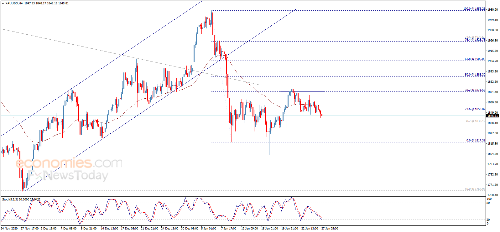 根据Economies.com,随着金价跌破关键支撑1850.80美元/盎司,金价后市可能还将进一步下滑。