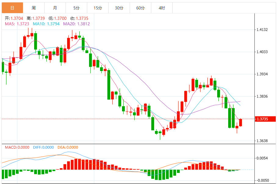 从技术面来看,4小时在上周阶段走势相对是比较平稳的,向上冲击区间高点并未企稳,随后跌破1.390的区间底部,进一步向下测试1.375的顶底转换支撑点,不过在4小时的RSI指标上来看,在进一步测试30%形成双底,从而使英镑的跌幅进一步受到限制,所以接下来的英镑基本上就是震荡修整,上方需要注意1.390-1.400的压力。