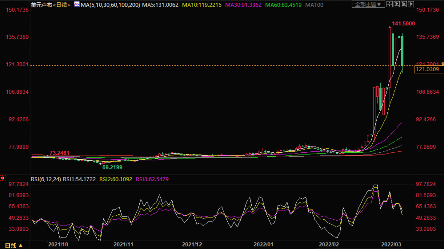 周四,卢布汇率继续下跌,兑美元汇率跌至120比1,截止目前美元兑卢布下跌至120.20,跌幅11.43%。进入今年以来,卢布对美元总体贬值了大约50%,其中2月24日至3月9日这段时间贬值了33%。