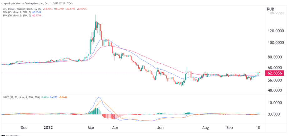 在上一次对俄罗斯卢布的预测中,我预测卢布即将反弹。这种观点并不成立,因为美元/卢布在美联储鹰派的背景下持续走高。该指数已成功略高于25日和50日移动均线。该货币对也突破了重要阻力位62,这是9月份的最高水平。