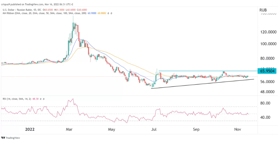 日线图显示,美元兑卢布汇率最近处于盘整阶段。在此期间,该指数一直保持在50日移动均线和25日移动均线,而相对强度指数一直停留在中性点50,它还形成了一个上升的三角形图案。