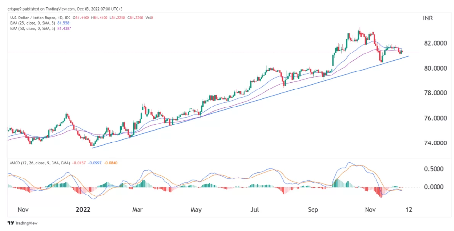 美元兑印度卢比价格也出现波动,因投资者对最新的美国非农就业数据做出反应。根据美国劳工统计局(BLS)的数据,美国经济在11月份增加了28万多个就业岗位,而失业率仍保持在3.7%的历史低点。