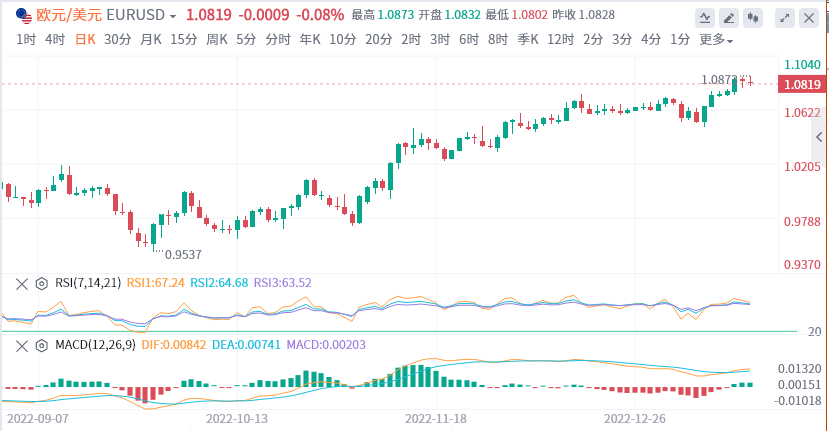 欧元兑美元自去年9月跌破与美元平价以来连续上涨。欧元多头周一将汇价推高至重要的心理阻力位1.08,但尚未确立自己高于该水平,现在可能有点过度扩张。