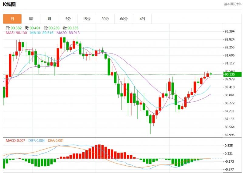 备选策略: 向上突破 90.73 ,将带来继续上行的趋势,目标位定在 91.15 和 91.41 。