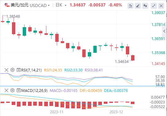12月14日,周四亚市盘中,美元/加元扩大跌势,跌破1.3500关口。美联储(Fed)会议后美元下跌打压美元/加元。截至记者发稿时,美元/加元报1.3463,全天下跌0.40%。