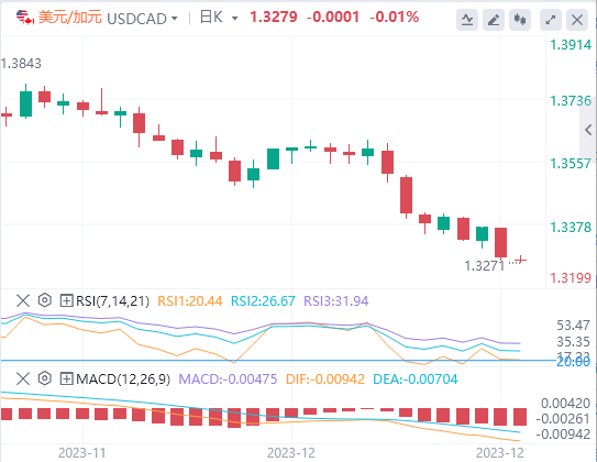 美元/加元的移动平均趋同背离(MACD)技术指标暗示潜在的看跌趋势。MACD线位于中线下方,加上信号线下方的背离,表明有可能进一步下跌。