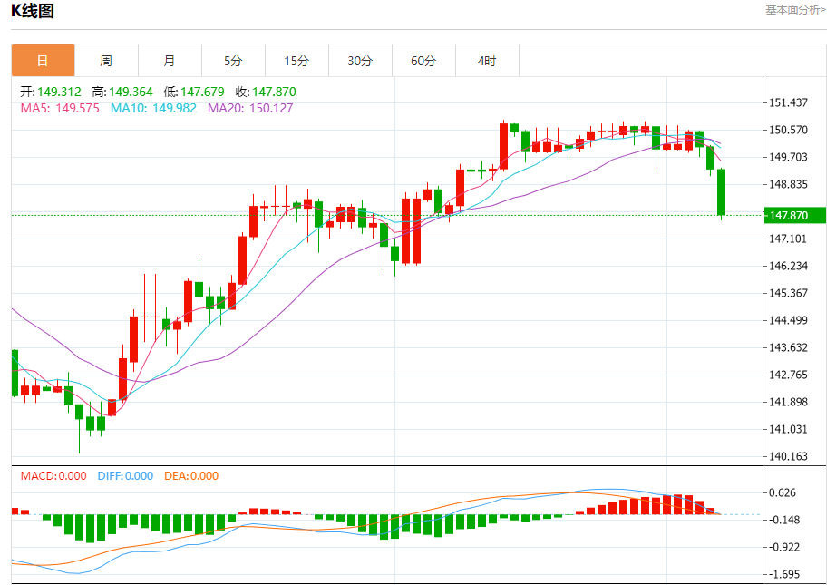 周四纽盘,美元兑日元交投于147.886,跌幅为0.97%。