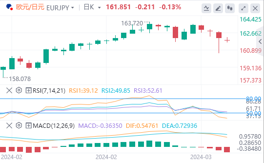 短期阻力水平在100EMA均线162.30。关键阻力将是162.95-163.00(3月6日高点,心理整数水平)。更上方,下一个上行阻力在3月4日高点163.50和保利加通道顶部163.71。