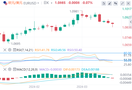 上行方面,在周线高点1.0998(1月11日)和心理关口1.1000之前,欧元/美元预计将在3月份高点1.0981(3月8日)测试初步阻力。若欧元/美元进一步上涨,可能会重测2023年12月高位1.1139(12月28日)。