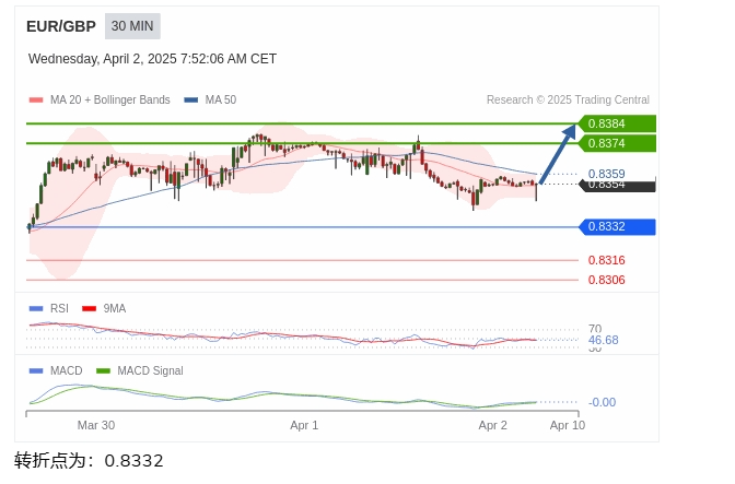 周三盘中,欧元/英镑报0.8354, 涨幅0.14%.