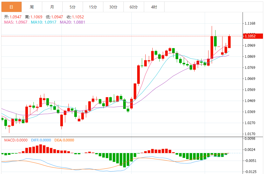 周三,欧元/美元徘徊于1.1049下方,现交投于1.1048附近,涨幅0.84%。