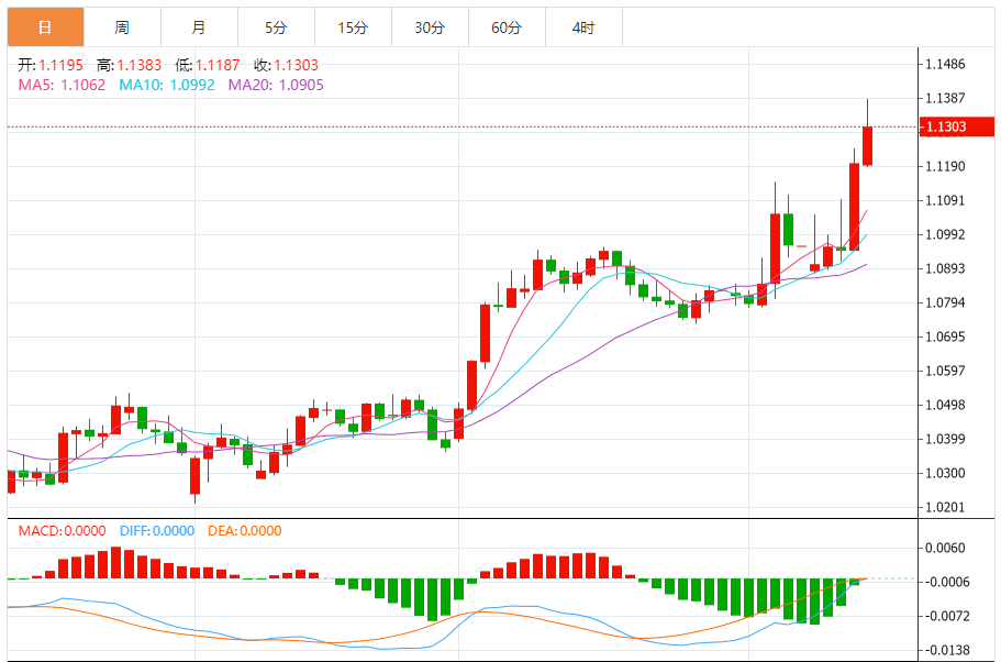 周五,欧元/美元徘徊于1.1303下方,现交投于1.1301附近,涨幅0.92%。