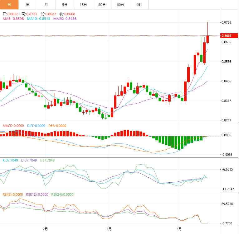从技术信号来看,在日线图层面,欧元兑英镑近期呈现出强劲的上升态势。均线系统已形成多头排列,5 日均线、10 日均线等短期均线持续向上发散,为价格上涨提供有力支撑,显示出多头力量占据主导地位。指数平滑异同移动平均线(MACD)指标中,快线和慢线均在零轴上方运行,且柱状图为红色,表明多头动能强劲,上涨趋势有望延续。相对强弱指标(RSI)目前处于 65 附近,显示市场处于强势区域,但需留意超买风险,若 RSI 继续攀升并接近 70 上方,可能暗示短期上涨过度,存在回调需求。