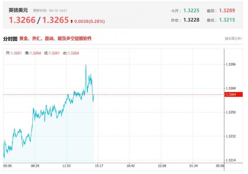 周三盘中,英镑/美元报1.3260, 涨幅0.28%.