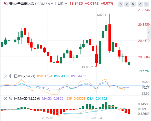 市场情绪低迷,因为对关税的担忧依然存在。美国对中国芯片出口实施限制,给主要半导体公司带来了压力,导致以科技股为主的纳斯达克指数下滑。尽管如此,中国在2025年第一季度报告的好于预期的国内生产总值(GDP)数据为新兴市场(EM)货币如比索提供了支撑。