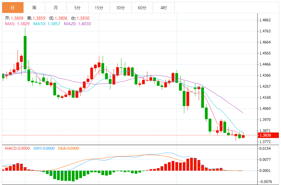 周三,美元/加元徘徊于1.3830下方,现交投于1.3828附近,涨幅0.15%。
