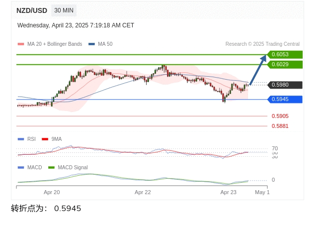 备选策略: 向下跌破 0.5945 ,将带来继续下跌的趋势,目标位为 0.5905 然后为 0.5881 。