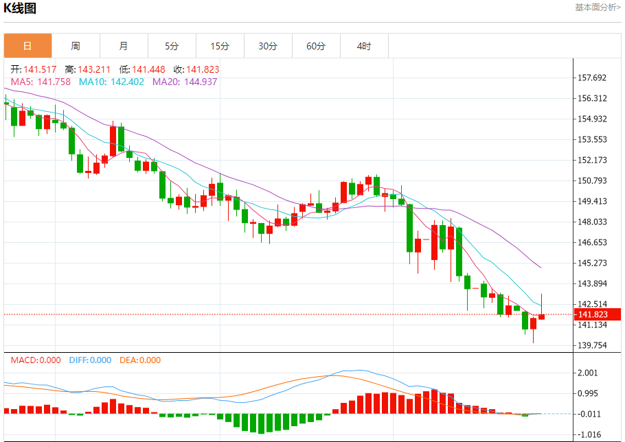 今日周三,欧元兑美元报1.1409,跌幅0.11%;英镑兑美元报1.3308,跌幅0.17%;美元兑日元报141.804,涨幅0.15%。