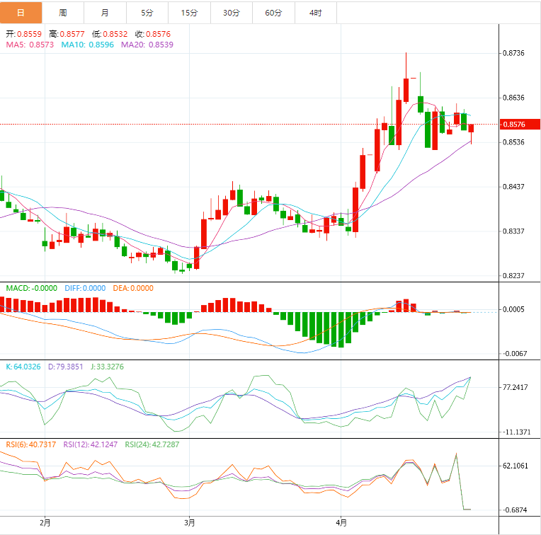 从日线图来看,欧元兑英镑在过去一段时间内呈现出较为复杂的震荡格局。近期,价格在震荡中逐渐上行,显示多头力量有所增强。5 日均线和 10 日均线呈现多头排列,5 日均线自下而上穿过 10 日均线,形成金叉,这通常被视为短期多头趋势确立的信号。MACD 指标方面,柱状图在零轴上方逐渐增长,且 MACD 线位于信号线之上,表明多头动能正在逐渐增强,市场处于多头占优的状态。相对强弱指数(RSI)处于 55 附近,显示市场多头力量稍占上风,但尚未进入超买区域,暗示上涨趋势仍有一定的延续空间。