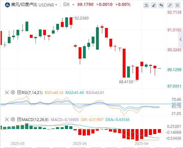 印度卢比当天交易坚挺。美元/印度卢比货币对的看跌基调占上风,因为该货币对在每日时间框架上低于关键的100天指数移动平均线(EMA)。14天相对强弱指数(RSI)位于38.35附近的中线下方,表明进一步下行看起来有利。