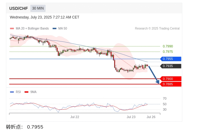 周三盘中,美元/瑞郎报0.7935, 涨幅0.13%.
