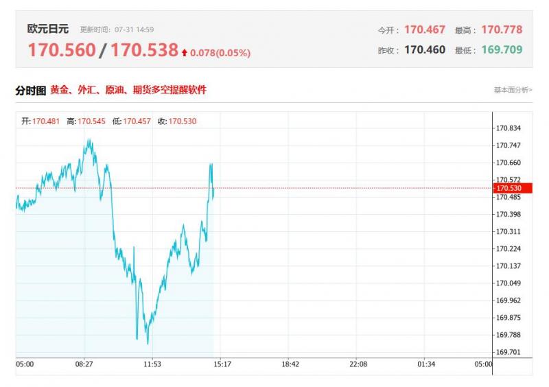 周四盘中,欧元/日元报170.89, 涨幅0.05%.