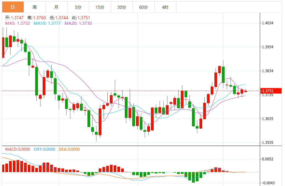 周一,美元/加元徘徊于1.3753下方,现交投于1.3751附近,跌幅0.04%。