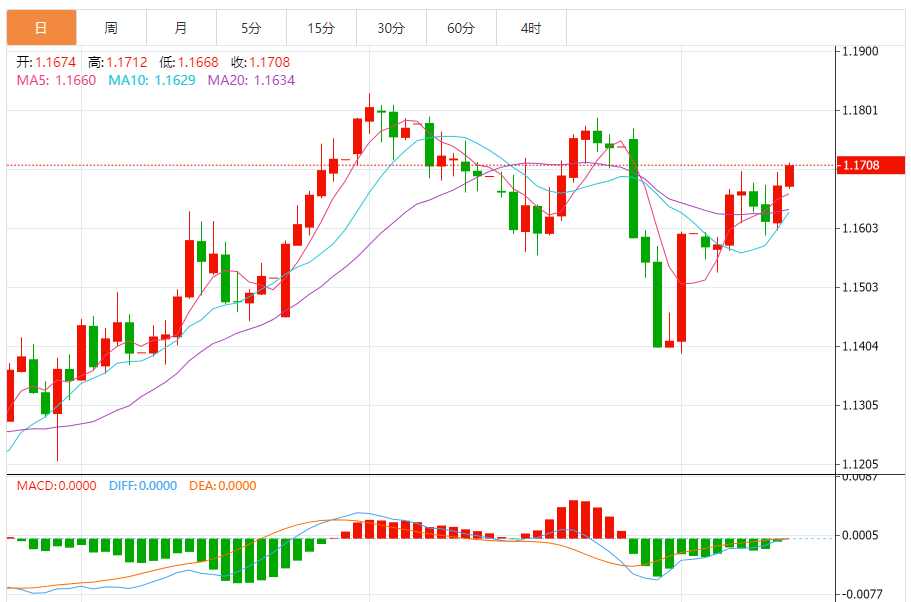 周三,欧元/美元徘徊于1.1709下方,现交投于1.1708附近,涨幅0.29%。