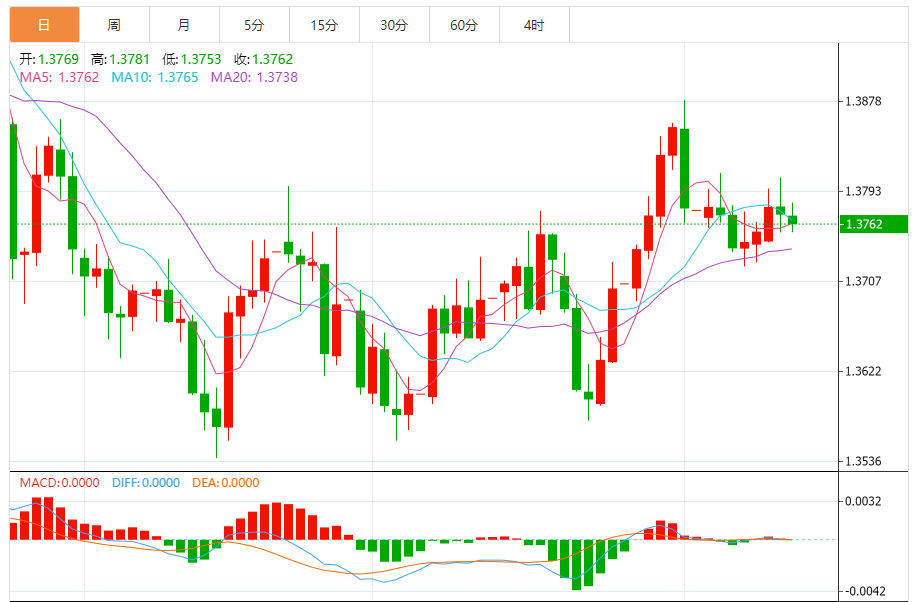 周三,美元/加元徘徊于1.3764下方,现交投于1.3762附近,跌幅0.07%。