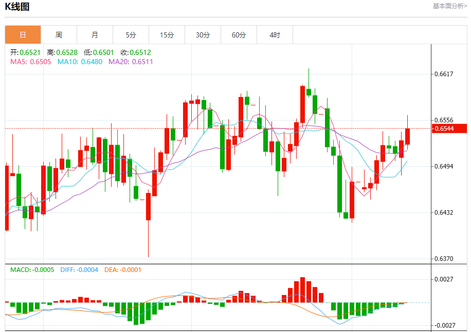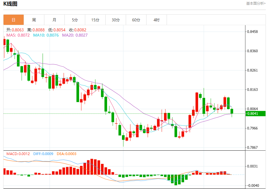 今日周三,澳元兑美元报0.6545,涨幅0.24%;美元兑加元报1.3769,跌幅0.03%;美元兑瑞郎报0.8043,跌幅0.25%。
