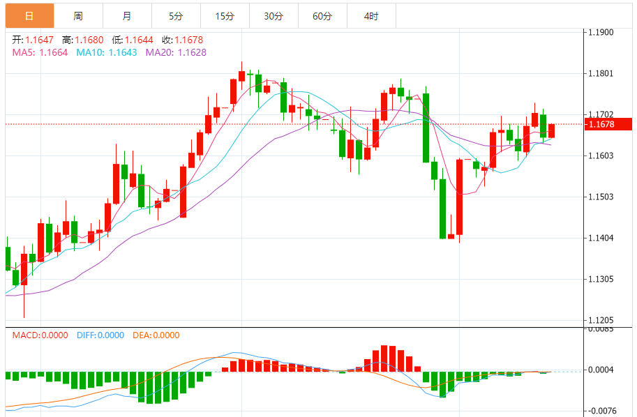 周五,欧元/美元徘徊于1.1679下方,现交投于1.1678附近,涨幅0.25%。