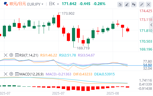 欧元/日元交叉盘可能会测试9日均线171.95的直接关口。突破该水平将增强短期价格势头,并支撑货币交叉盘接近173.60附近的上升通道上限,随后是173.90,这是2025年7月28日创下的2024年7月以来的最高水平。