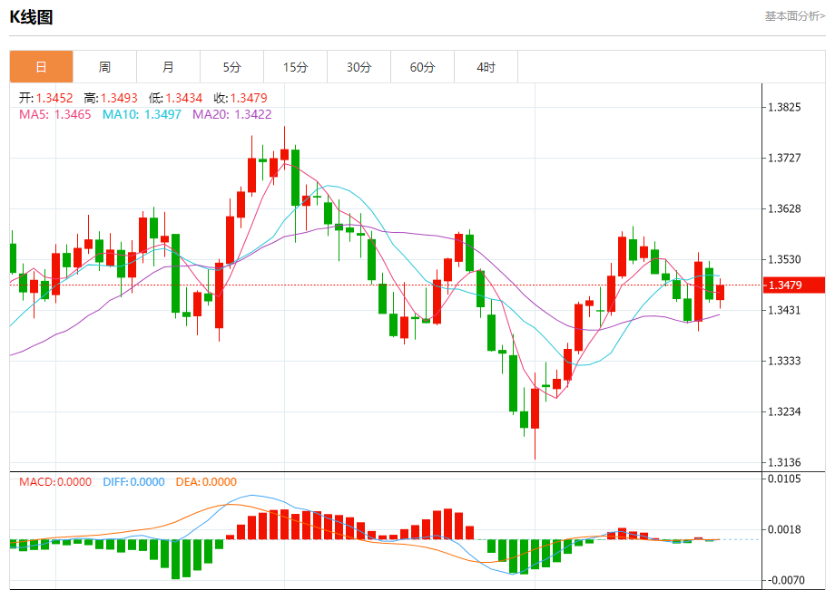 技术点评:RSI技术指标小于中性区域50。 MACD技术指标处在其信号线之下看空。 配置为负。 此外,价位低于其20天及50天移动平均线 ( 分别位于1.3501 和1.3510 )。