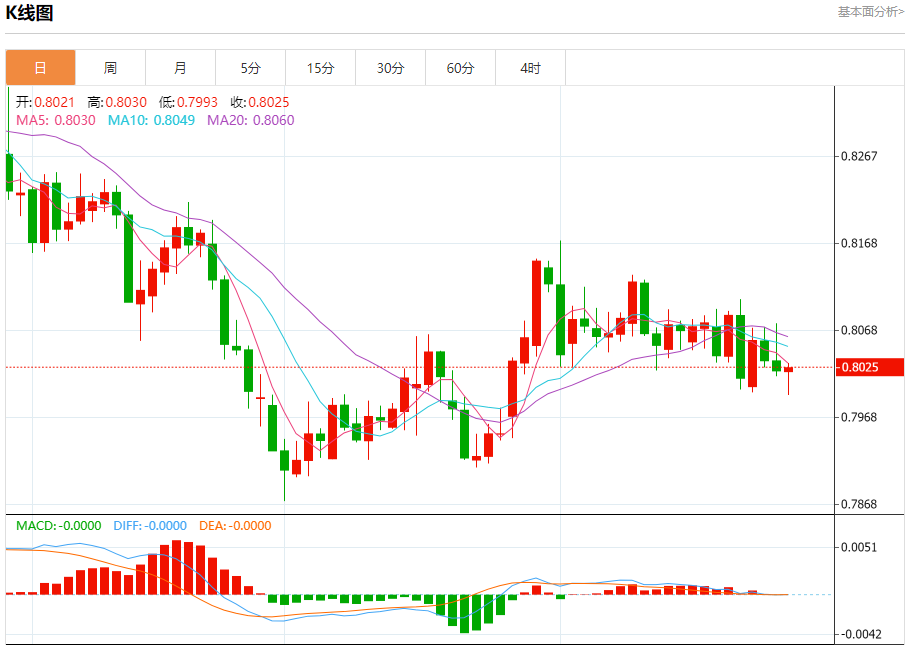 技术点评:RSI技术指标小于中性区域50。 MACD技术指标处在其信号线之下看空。 配置为负。 此外,价位低于其20天及50天移动平均线 ( 分别位于0.8046 和0.8045 )。