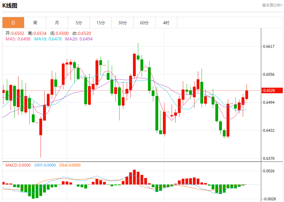技术点评:RSI技术指标大于70。在这种情况下,说明有很强的上升趋势,或者意味着处在超买的状态下,可能会有向下的调整。我们将观察RSI技术指标是否出现背离现象。 MACD技术指标处在其信号线之上看多。 配置为正。 此外,价位高于其20天及50天移动平均线 ( 分别位于0.6485 和0.6488 )。